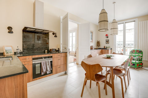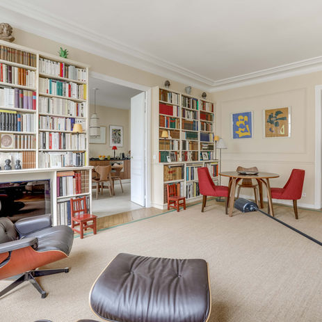 La cuisine, repensée comme une véritable pièce à vivre, conjugue convivialité et modernité tout en préservant le charme de l’ancien. Le parquet en point de Hongrie et les moulures ont été entièrement rénovés pour restituer l’élégance d’origine de l’appartement. Nous avons également conçu et intégré de nombreuses bibliothèques et rangements sur mesure, remis aux normes l’ensemble de la plomberie et de l’électricité, et réalisé une mise en peinture globale dans des tonalités pastel, apportant douceur et luminosité.